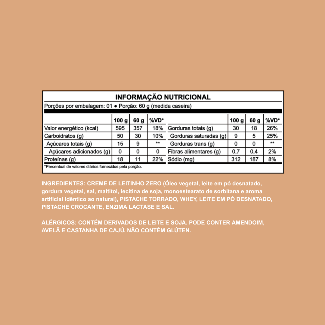 Feito com pistache de verdade, sem açúcar, sem glúten, sem lactose e com 14g de proteína.